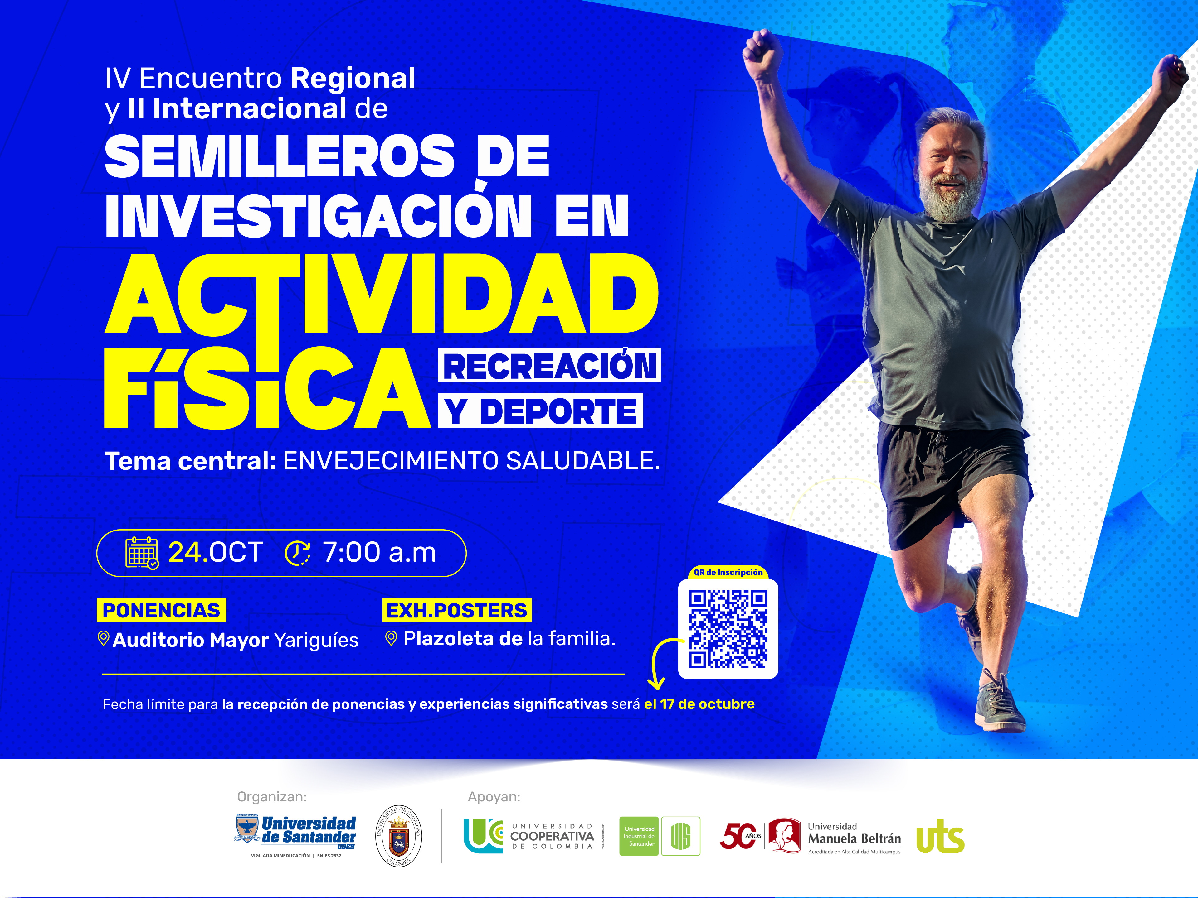La Universidad de Santander (UDES) te invita al "IV Encuentro Regional y II Internacional de Semilleros de Investigación en Actividad Física, Recreación y Deporte" con el tema central: Envejecimiento Saludable.