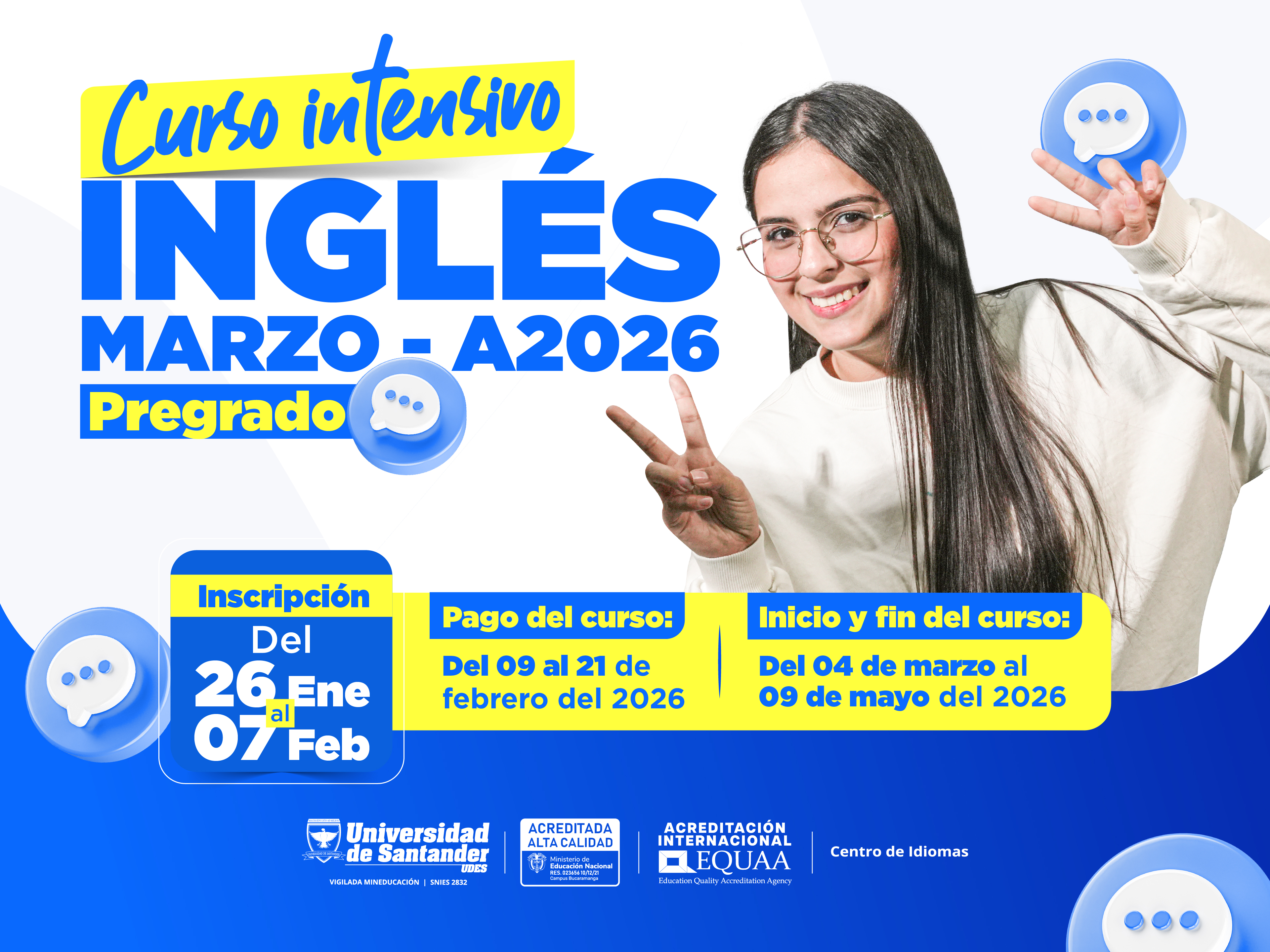 El Centro de Idiomas de la Universidad de Santander (UDES) te invita al "Curso Intensivo de Inglés Marzo - A 2026", dirigido especialmente a estudiantes de pregrado.
